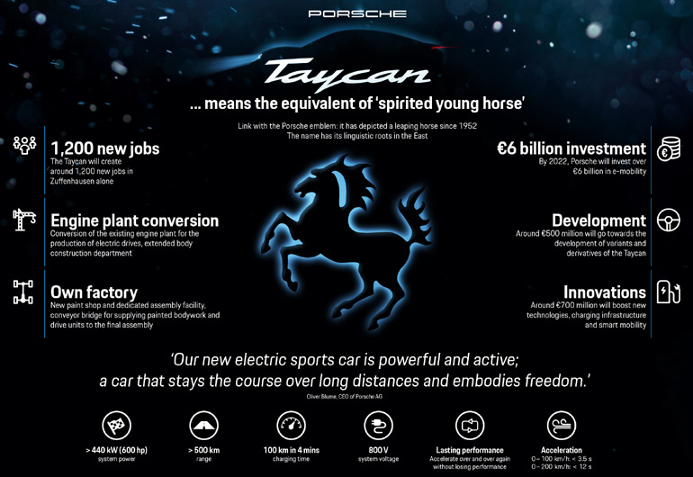 Το όνομα Taycan μεταφράζεται σε «τολμηρό, νεαρό άλογο». Στόχος της Porsche είναι ένα φτιάξει ένα πρωτοποριακό αισθητικά και τεχνολογικά όχημα που διατηρεί όλες τις αξίες και την παράδοση της μάρκας. Το αυτοκίνητο θα τροφοδοτείται από δύο ηλεκτροκινητήρες και θα είναι διαθέσιμο σε τρεις εκδόσεις ισχύος – από 400 έως 600+ ίππους.
