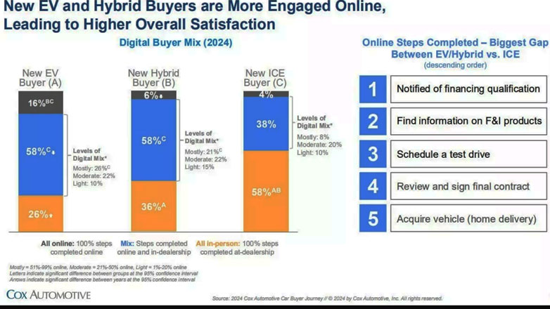 Ωστόσο, η ικανοποίηση ποικίλλει ανάλογα με το τι αγοράζετε. Το 82% των νέων αγοραστών EV ήταν «πολύ ικανοποιημένοι», το οποίο ξεπέρασε τα ποσοστά για τα υβριδικά (76%) και τα οχήματα με κινητήρα εσωτερικής καύσης (75%). Μεγάλο μέρος αυτού αποδίδεται στη χρήση ψηφιακών εργαλείων κατά τη διαδικασία αγοράς. Όπως εξήγησε η εταιρία, το 76% των αγοραστών EV χρησιμοποίησαν ψηφιακά εργαλεία, ενώ μόνο το 42% των αγοραστών ICE οχημάτων τα αξιοποίησαν.