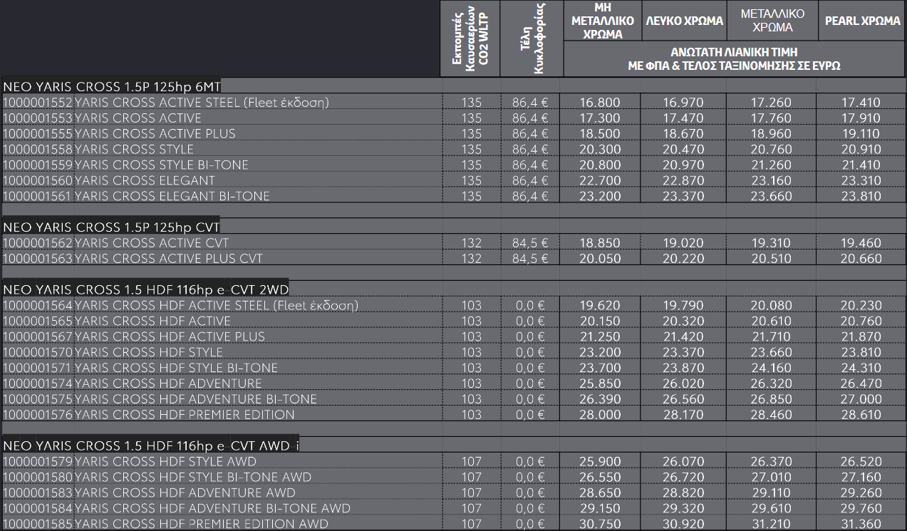 Το Yaris Cross ξεκινά από τα 17.300 ευρώ στην έκδοση με τον ατμοσφαιρικό κινητήρα των 125 ίππων και από τα 20.150 ευρώ στην υβριδική. Οι υποψήφιοι αγοραστές μπορούν να κλείσουν την παραγγελία από σήμερα κιόλας, με τις παραδόσεις να προγραμματίζονται προς τα τέλη του καλοκαιριού ή τον Σεπτέμβριο.