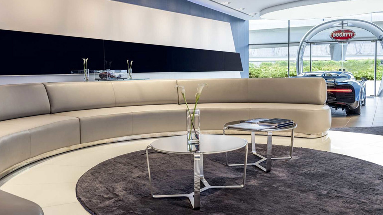 Τα έπιπλα, οι πολυθρόνες και οι καναπέδες, φέρουν τα ίδια υλικά (ανθρακονήματα, δέρμα) με το υπερ-αυτοκίνητο. Η Chiron είναι το κορυφαίο τετράτροχο και ο χώρος που φιλοξενείται πρέπει να αντανακλά πάνω της. Ο πελάτης που θα επισκεφθεί την αντιπροσωπεία, επιθυμεί την αποκλειστικότητα, τη χλιδή και υπηρεσίες που ξεπερνούν οποιαδήποτε έκθεση στον κόσμο.