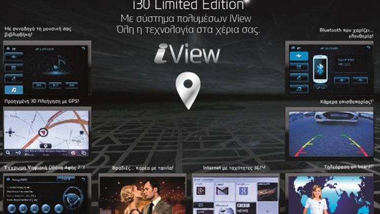 Το σύστημα πολυμέσων ονομάζεται iView και προσφέρεται δωρεάν στην έκδοση i30 Limited Edition. Διαθέτει έγχρωμη οθόνη αφής 7 ιντσών υψηλής ανάλυσης, 3D πλοήγηση με GPS στην ελληνική γλώσσα, με λογισμικό Ginius Driver, χάρτη Geointelligence και τριετή δωρεάν αναβάθμιση. Επίσης, θύρες iPod, USB, mini USB και micro SD, Applications (ημερολόγιο, ατζέντα και παιχνίδια), DVD Player, Bluetooth, σύνδεση με χειριστήρια στο τιμόνι, φωτισμό πάνελ και ηχεία αυτοκινήτου.