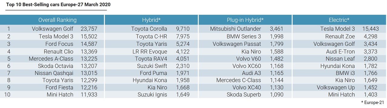 To πιο καλοπουλημένο μοντέλο του Μαρτίου και μάλιστα με διαφορά ήταν το Volkswagen Golf με 23.757 πωλήσεις. Στη δεύτερη θέση βρέθηκε το Tesla Model 3 με 15.502 μονάδες, ενώ τρίτο ήταν το Ford Focus με 14.587 παραδόσεις. Ακολούθησαν τα Renault Clio (13.369) και Mercedes A-Class (13.225), με τη δεκάδα να συμπληρώνουν τα Skoda Octavia (13.207), Nissan Qashqai (13.015), Toyota Yaris (12.299), Ford Fiesta (12.216) και MINI Hatchback (11.933).