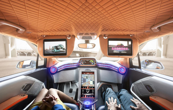 Οι επιβάτες έχουν στη διάθεσή τους πλειάδα gadgets, μεταξύ των οποίων και ρολόγια χειρός (smartwatch), ελέγχοντας από αυτά κάθε λειτουργία του αυτοκινήτου. Εντυπωσιακά είναι και τα δίτροχα μίνι ηλεκτρικά οχήματα που φιλοξενούνται στις πίσω θέσεις.