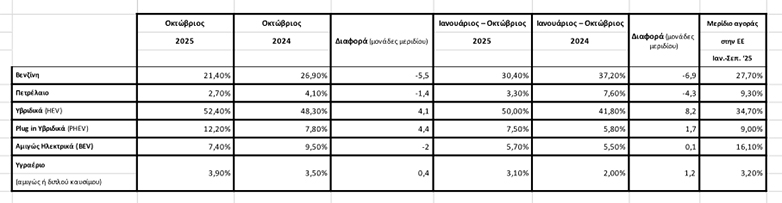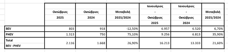 Αντίθετα στην κατηγορία των PHEV είχαμε μεγάλη αύξηση. Το 2024 είχαμε 750 και τον Οκτώβριο του 2025 έφτασαν τις 1313 ταξινομήσεις, δηλαδή αύξηση 75.1%.