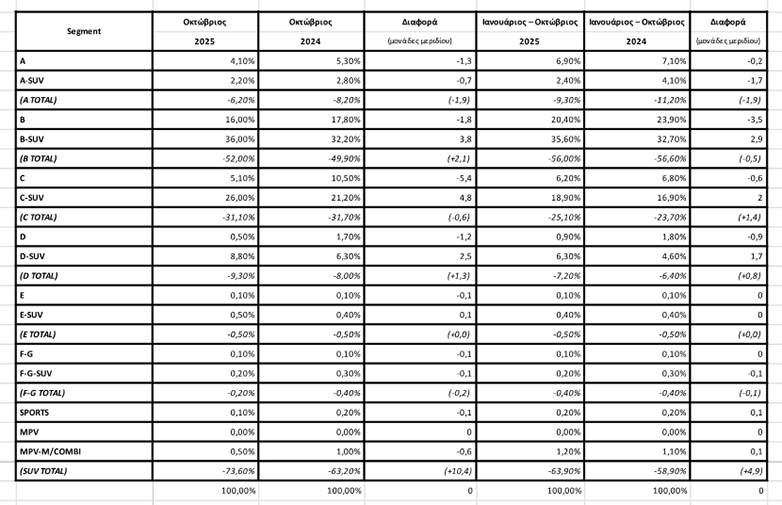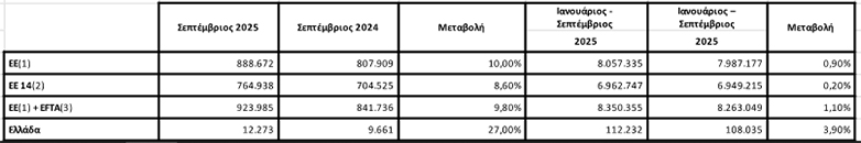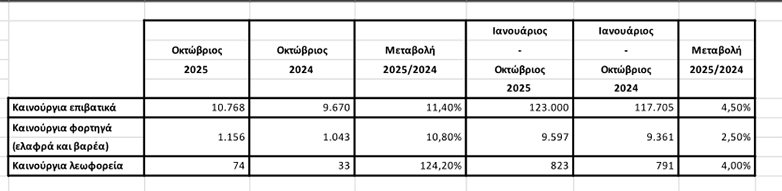 Τον Οκτώβριο 2025 ταξινομήθηκαν 10.768 αυτοκίνητα ενώ τον Οκτώβριο 2024 ταξινομήθηκαν 9.670 νέα αυτοκίνητα. Από εκεί προκύπτει η αύξηση του 11.4%.