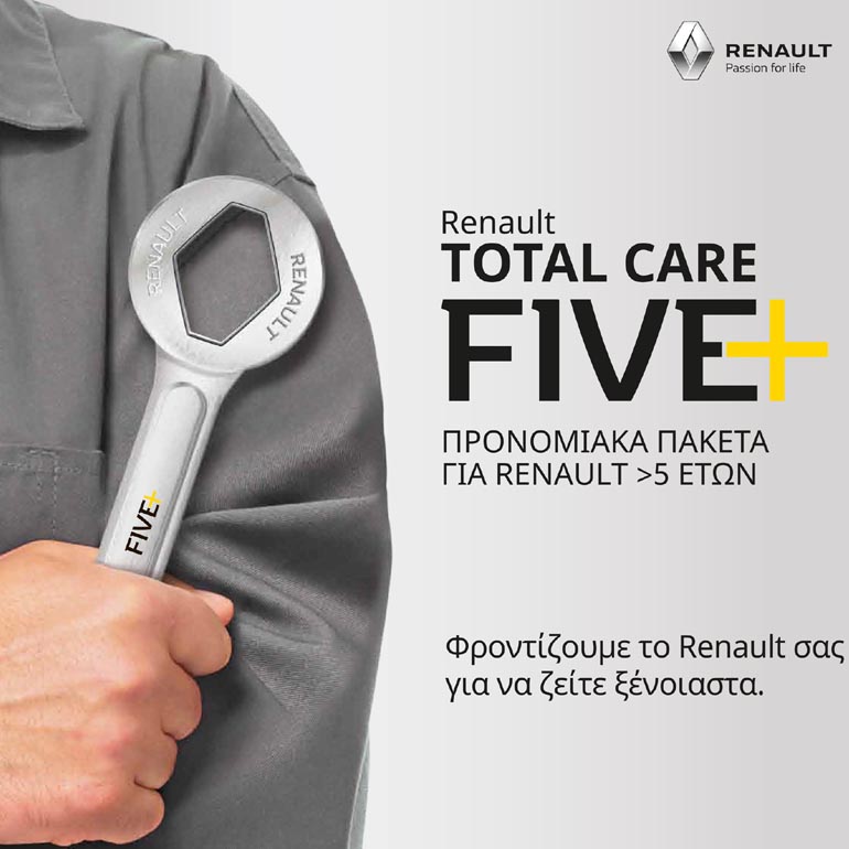 Το Renault Total Care 5+, περιλαμβάνει 10 πακέτα συντήρησης και επισκευής τα οποία καλύπτουν σχεδόν το σύνολο των εργασιών που μπορεί να χρειαστεί ένα αυτοκίνητο. Το κόστος ξεκινά μόλις από τα 58 ευρώ, ενώ σε κάθε περίπτωση στην τιμή περιλαμβάνεται το κόστος εργασίας και ανταλλακτικών (συμπεριλαμβανομένου του Φ.Π.Α.), προσφέροντας απόλυτη διαφάνεια, αφού ο πελάτης γνωρίζει εκ των προτέρων το ακριβές ποσό που θα καταβάλει για την ολοκλήρωση της επισκευής.