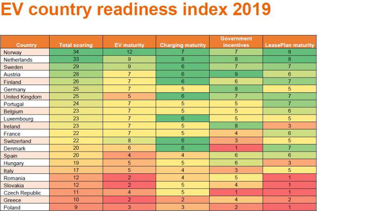 Ο δείκτης LeasePlan EV Readiness Index 2019 βασίζεται σε τέσσερις παράγοντες και δείχνει τα βήματα προόδου που έχουν κάνει 22 ευρωπαϊκές χώρες όσον αφορά στην ωριμότητα της αγοράς ηλεκτροκίνητων αυτοκινήτων, στην ωριμότητα των υποδομών, τα κυβερνητικά κίνητρα και την εμπειρία της LeasePlan στα ηλεκτρικά οχήματα σε κάθε χώρα.