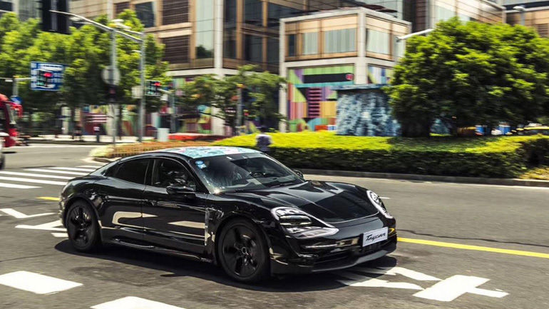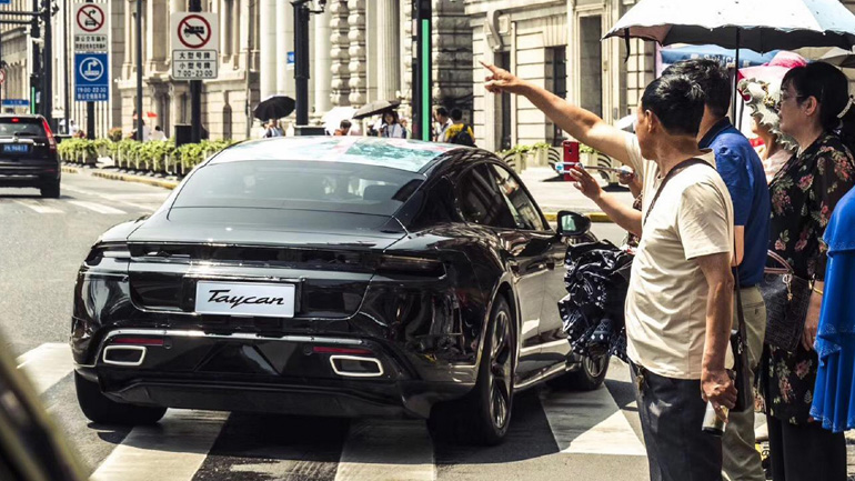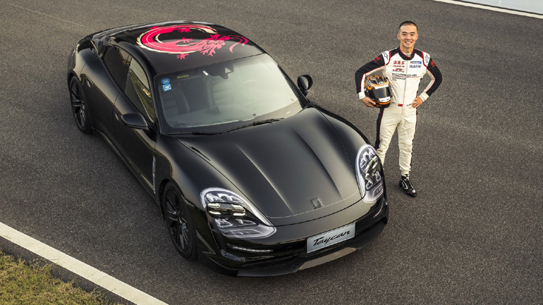 Η Taycan που κυκλοφορεί στην Κίνα φέρει στην οροφή έναν δράκο και πίσω από το τιμόνι βρίσκεται ο εργοστασιακός οδηγός του Porsche Carrera Cup Asia, Li Chao.