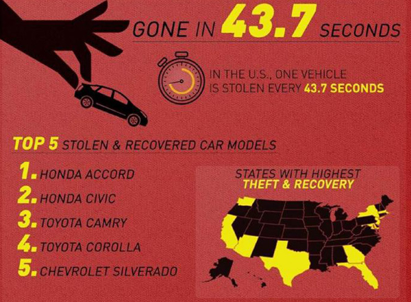 Σύμφωνα με πρόσφατη έρευνα που έγινε στις ΗΠΑ, κάθε 43,7 δευτερόλεπτα κλέβεται σε κάθε δρόμο των πολιτειών της Αμερικής, ένα αυτοκίνητο, με τα μοντέλα της Honda να είναι πρώτα στις προτιμήσεις των κακοποιών.