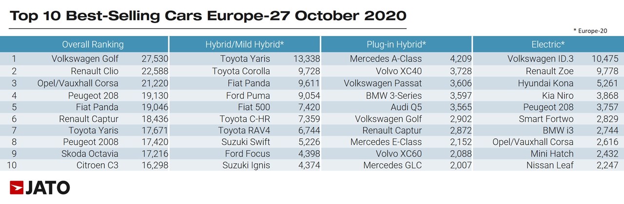 Σύμφωνα με τον οργανισμό Jato Dynamics, τον Οκτώβριο ταξινομήθηκαν στην Ευρώπη 1.127.624 νέα οχήματα, σημειώνοντας μείωση 7% σε σχέση με τον αντίστοιχο μήνα του 2019. Το 26,8% αυτών είχαν μορφή ηλεκτροκίνησης (υβριδικά, plug-in υβριδικά, ηλεκτρικά), με το πιο καλοπουλημένο μοντέλο να είναι το Volkswagen ID.3.