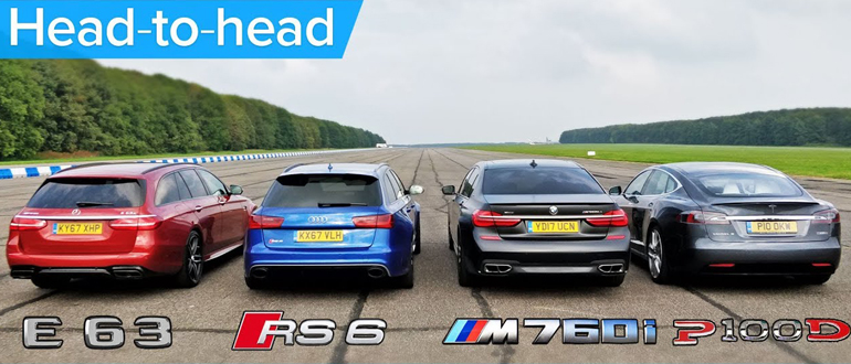Το βρετανικό «CarWow» πραγματοποίησε μία από τις καλύτερες και πιο ενδιαφέρουσες κόντρες που έχουμε δει φέτος, βάζοντας απέναντι από τα κυρίαρχα γερμανικά μοντέλα Audi RS 6 Avant, BMW M760Li και Mercedes-AMG E63 Estate, το αμερικανικό Tesla Model S P100d.