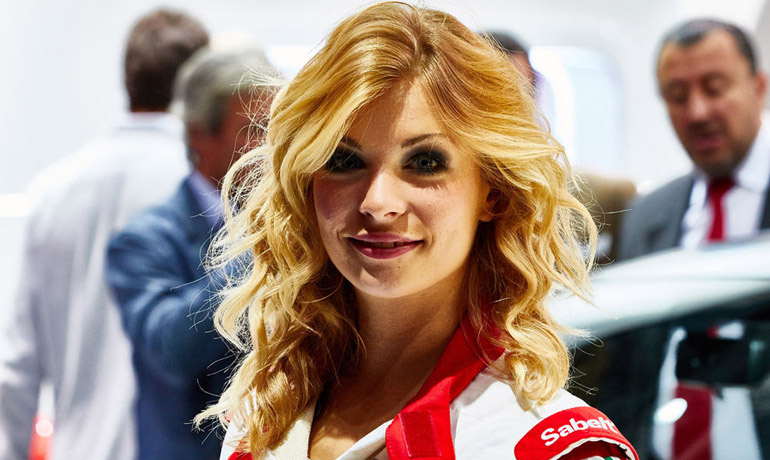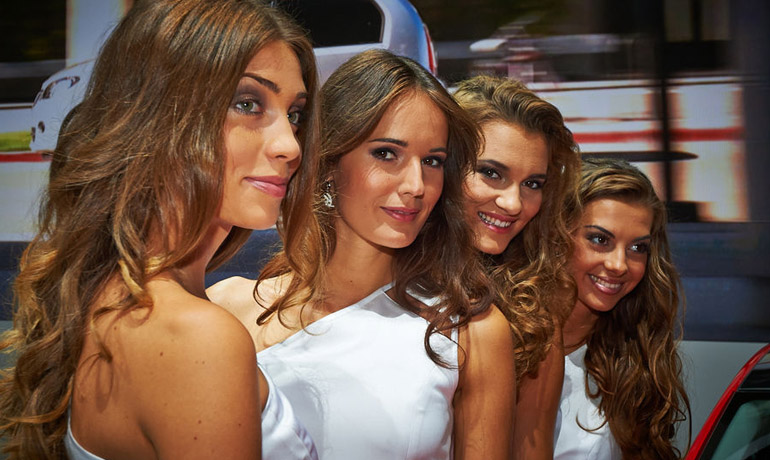Από τα περίπτερα των εταιρειών δεν θα μπορούσαν να λείπουν βέβαια και τα κορίτσια, τα οποία αποτελούν παραδοσιακά πόλο έλξης σε κάθε σαλόνι αυτοκινήτου. Οι ξανθές και μελαχρινές καλλονές, ποζάρουν με χάρη και νάζι δίπλα στα τετράτροχα μοντέλα, μονοπωλώντας το βλέμμα όχι μόνο του κοινού, αλλά και των στελεχών.