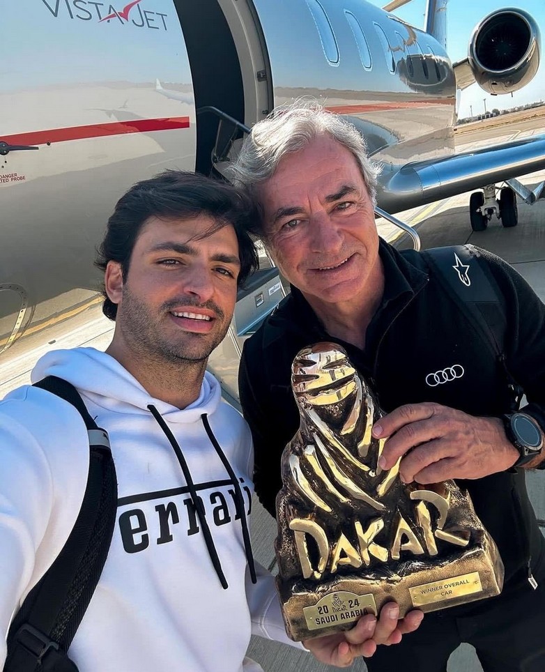 Ο γιός Carlos Sainz οδηγός της F1 δίπλα στον πατέρα Carlos Sainz, νικητή του φετινού Dakar. Ο Carlos Sainz (πατέρας) με συνοδηγό τον Lucas Cruz κέρδισαν το δύσκολο αγώνα των 7.891 χιλιομέτρων και μετά από 15 ημέρες αγώνα ανέβασαν πρώτο στη ράμπα του τερματισμού το Audi RS Q e-tron που έχει ηλεκτροκίνηση στους 4 τροχούς. Η παροχή ενέργειας διασφαλίζεται με μια υψηλής τάσης μπαταρία με ένα μετατροπέα ενέργειας εξοικονομώντας 60% σε εκπομπές ρύπων σε σχέση με τα συμβατικά καύσιμα.