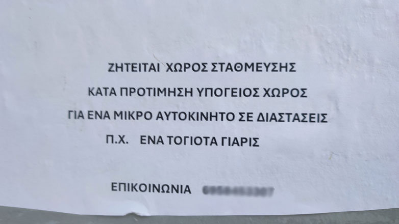 Απηύδησε ο άνθρωπος με το πάρκινγκ. Προκειμένου να αποφεύγει τις κλήσεις της Τροχαίας η το Δήμου αλλά κυρίως τις φθορές που προξενούν στα σταθμευμένα αυτοκίνητα οι ναρκομανείς της περιοχής, τύπωσε το αίτημά του και γέμισε όλες τις κολώνες στην περιοχή Αγίου Ελευθερίου (ανάμεσα στα Κάτω Πατήσια και τά Άνω Πατήσια). Και μην φαντασθείτε ότι έχει κανένα ακριβό αυτοκίνητο. Ένα μικρό Yaris έχει αλλά θέλει να έχει ασφάλεια και να κοιμάται ήσυχος ότι το πρωί να μην βρει καμένο. Φαντάσου να δίνεις δόσεις για να εξοφλήσεις το αυτοκίνητό σου και να στο κλέψουν η το κάψουν. Απόγνωση.