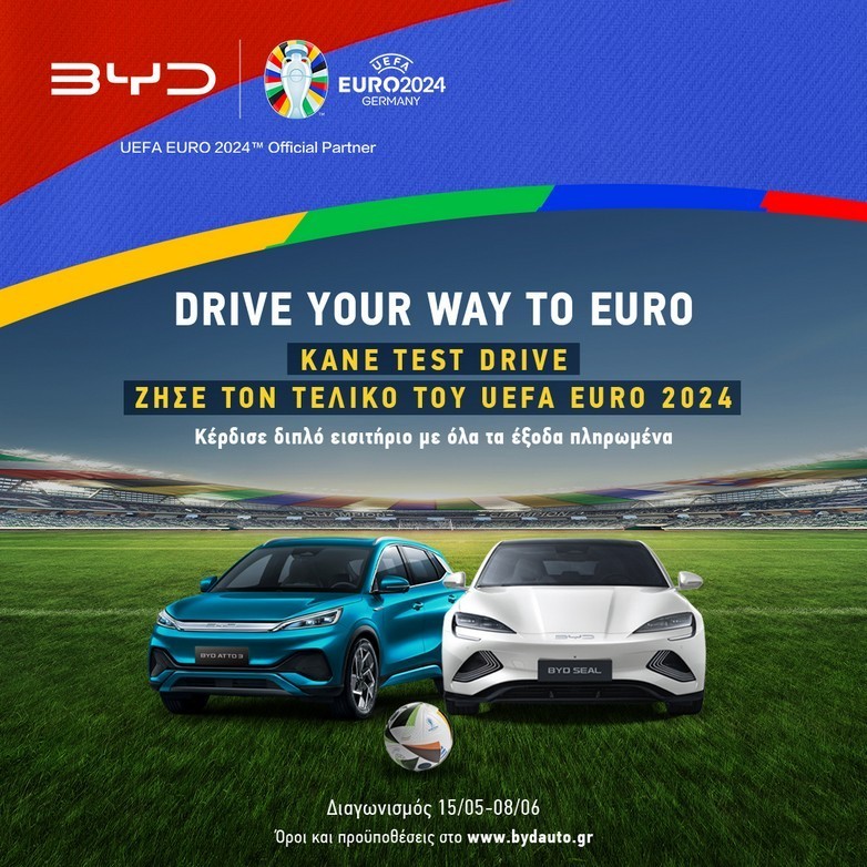 Η BYD «τριπλάρει» με το “Drive your way to Euro” και στέλνει δύο τυχερούς στον τελικό του UEFA EURO 2024. Η BYD (Build Your Dreams), Επίσημος Χορηγός του UEFA EURO 2024 έδωσε την ευκαιρία σε όσους πήραν μέρος στο διαγωνισμό “Drive your way to Euro” να ελπίζουν για δύο διπλά εισιτήρια για τον μεγάλο τελικό με όλα τα έξοδα πληρωμένα Καλή κίνηση.