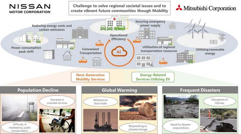 Η Nissan Motor Co., Ltd. (Nissan) και η Mitsubishi Corporation (MC) υπέγραψαν μνημόνιο συνεργασίας για την διερεύνηση μιας νέας κοινής πρωτοβουλίας σε υπηρεσίες κινητικότητας επόμενης γενιάς και υπηρεσίες σχετικές με την ενέργεια που χρησιμοποιούν ηλεκτρικά οχήματα (EVs). Στόχος είναι για να συμβάλουν στην επίλυση περιφερειακών κοινωνικών ζητημάτων και στη δημιουργία ζωντανών μελλοντικών κοινοτήτων. Η Ιαπωνία ως χώρα αντιμετωπίζει ζητήματα όπως οι ελλείψεις οδηγών λόγω της μείωσης του πληθυσμού και οι δυσκολίες διατήρησης των υπηρεσιών δημόσιων συγκοινωνιών λόγω της μείωσης του αριθμού των χρηστών. Η Nissan και η MC έχουν αναλάβει διάφορες πρωτοβουλίες για την επίλυση αυτών των προκλήσεων.