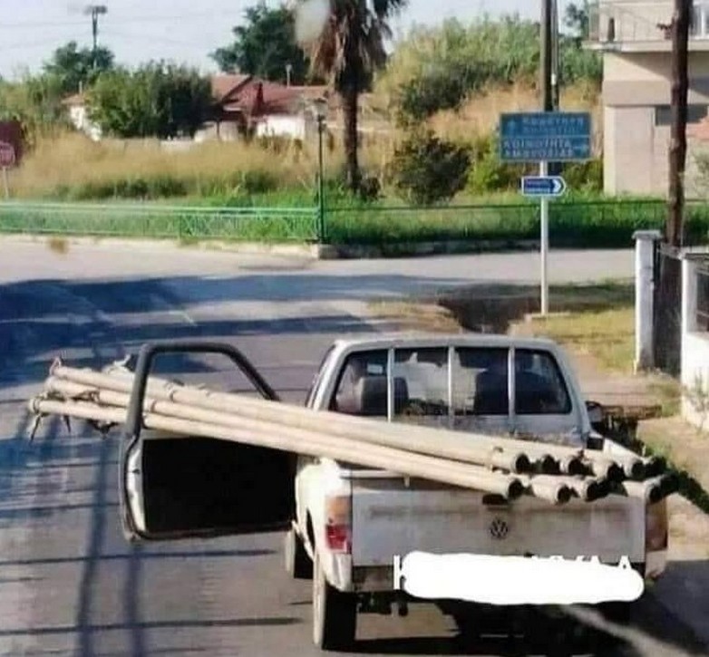 Επίγνωση του λάθους όμως δεν έχει και ο άλλος οδηγός που μεταφέρει τους σωλήνες. Παρατηρείστε ότι επειδή δεν είχε που να τους στηρίξει άνοιξε την πόρτα και έλυσε το πρόβλημα. Όσες φορές οι αστυνομικοί βρέθηκαν μπροστά σ αυτές τις πρωτοφανείς περιπτώσεις, διαπίστωσαν ότι άλλοι οδηγοί είχαν ανασφάλιστα τα οχήματα τους (καλά ούτε που διανοούμαστε να τα είχαν περάσει από το ΚΤΕΟ), άλλοι δεν είχαν άδεια οδήγησης και σε κάποιες άλλες παραβάσεις οι οδηγοί ήταν ανήλικοι. Για ποια παιδεία μιλάμε και για πιο σεβασμό στον ΚΟΚ.
