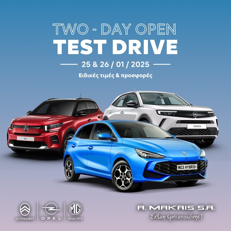 Ένας κάλος τρόπος για να γνωρίσουν και να αποφασίσουν πιο εύκολα οι υποψήφιοι αγοραστές για τα αυτοκίνητα που θέλουν να αποκτήσουν είναι να τα γνωρίσουν. Τόσο εγκυκλοπαιδικά για τις δυνατότητες που έχουν όσο και οδηγικά. Είναι μια ξεχωριστή εμπειρία που πάντα παίζει θετικό ρόλο. Ο επίσημος Διανομέας και Επισκευαστής Citroën, Opel, MG, SEAT και Cupra στην Ελλάδα, το Σάββατο 25 Ιανουαρίου ( 09.00—18.00) και την Κυριακή 26 Ιανουαρίου (09.00 -14.30) ανοίγει τις πόρτες στις εκθέσεις του και υποδέχεται τους ενδιαφερόμενους για μια πλήρη ενημέρωση. Ανοικτά για τη διήμερη εκδήλωση (ενημέρωση και Test-Drive σε όλους τους συμμετέχοντες) θα είναι για CITROËN, OPEL (στην έκθεση στην οδό Μαρίνου Αντύπα 98, Νέα Ιωνία- Tηλ.: 210 271 5445-6) και για την MG (στην οδό Μαρίνου Αντύπα 94, Νέα Ιωνία 14235- Tηλ.: 210 710 4317).