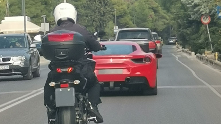Μέρα μεσημέρι στη λεωφόρο Θησέως, στο ύψος της Εκάλης.Mία Ferrari με έναν συνοδό που επιβαίνει σε μηχανή μεγάλου κυβισμού κατευθύνονται βόρεια.