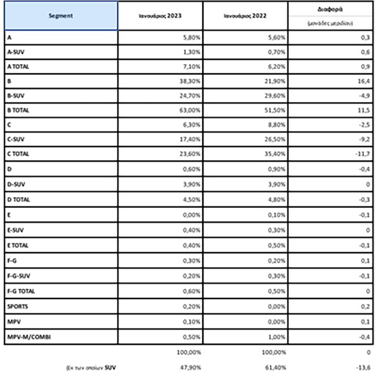 Η κατηγορία B-Total κέρδισε για ακόμη μια φορά τη μερίδα του λέοντος με 63% ενώ στη 2η θέση κατέλαβε με 38.3 % η B Segment. Me 24.7% στην 3η θέση κατέλαβε η κατηγορία με τα B-SUV.