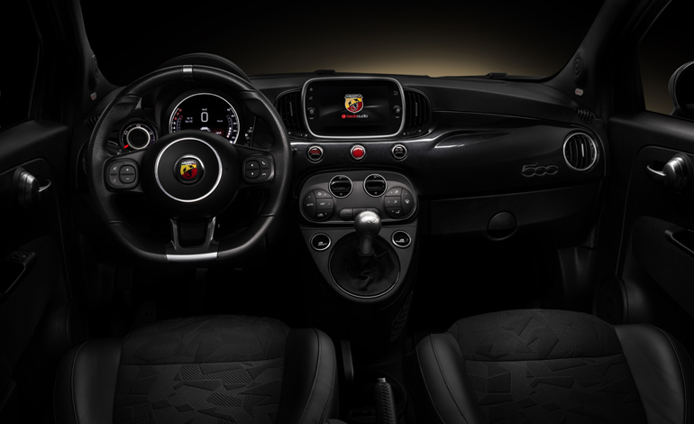 Στο εσωτερικό τα νέα σπορ καθίσματα Abarth «Scorpioflage» έχουν επένδυση από μαύρο δέρμα. Στο προσκέφαλο αναγράφεται η λέξη «Scorpioneoro» σε συνδυασμό με την ιταλική σημαία, ενώ το ταμπλό με τα ματ μαύρα στοιχεία, η χρυσή πλακέτα στο κεντρικό τούνελ και τα ειδικά ταπέτα ολοκληρώνουν την εικόνα.
