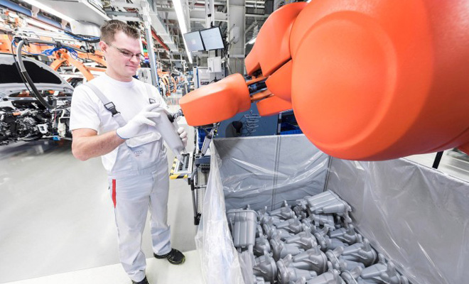 Ακολουθώντας το παράδειγμα της BMW, η Audi πρόσθεσε στο εργοστάσιο της στο Ingolstadt, ορισμένα ρομπότ τελευταίας γενιάς, τα οποία όχι απλά συνεργάζονται με τους εργαζομένους αλλά τους βοηθούν να κάνουν τη δουλειά πιο γρήγορα και ξεκούραστα.
