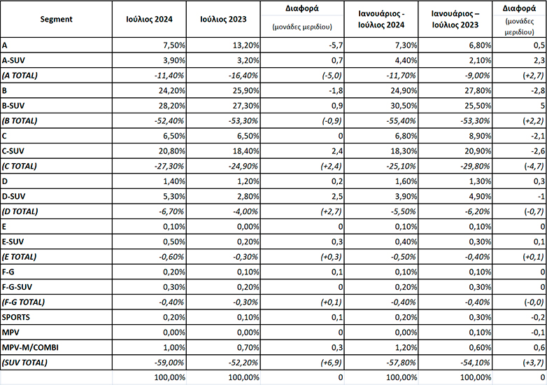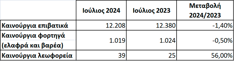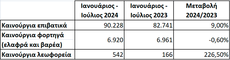 Οι ταξινομήσεις από τον Ιανουάριο μέχρι και Ιούλιο (2024) σε σύγκριση με το αντίστοιχο διάστημα του 2023 έχουν άνοδο +9%. Οι ταξινομήσεις των επιβατικών έφθασαν τις 90.228
