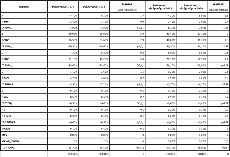 Η Β Total κατηγορία προτιμήθηκε και αυτό το μήνα. Το Φεβρουάριο (2025) είχε 56.5% ενώ το Φεβρουάριο (2024) είχε 59.6%. Η διαφορά είναι μικρή (-3%). Σύμφωνα με πρώτους υπολογισμούς, η πρόοδος στα segments επιβατικών και στην κατανομή ανά καύσιμο, ως τον Φεβρουάριο, έχει ως εξής:
