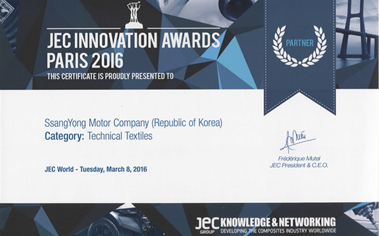 Πρόσφατα, η SsangYong απέσπασε ένα από τα σημαντικότερα τεχνολογικά βραβεία για την εφαρμογή τμημάτων με ανθρακονήματα (CFRP), στο πλαίσιο της φημισμένης έκθεσης JEC World Composites Show, η οποία διοργανώνεται από την παγκόσμια ομοσπονδία κατασκευών συνθετικών υλικών και διεξάγεται σε Ευρώπη, Αμερική και Ασία.