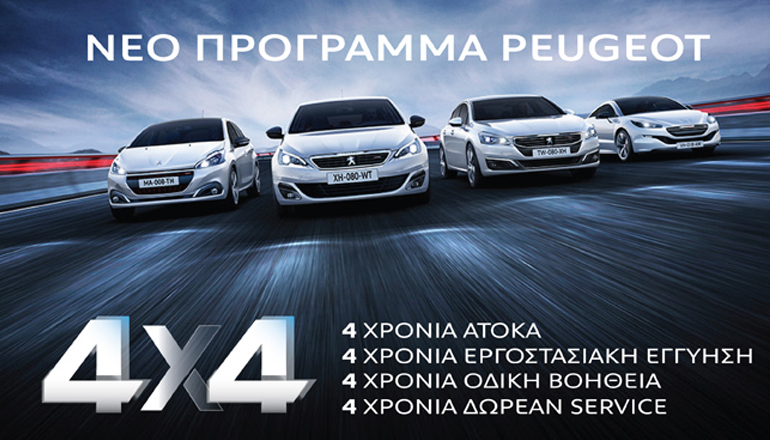Το πρόγραμμα ονομάζεται «Peugeot 4X4», αφορά όλα τα επιβατικά μοντέλα της γκάμας και ισχύει μέχρι το τέλος Ιουλίου. Όποιος επιθυμεί να αγοράσει ένα καινούργιο αυτοκίνητο της γαλλικής μάρκας, θα λάβει την παραπάνω «τετραπλή χρυσή παροχή».