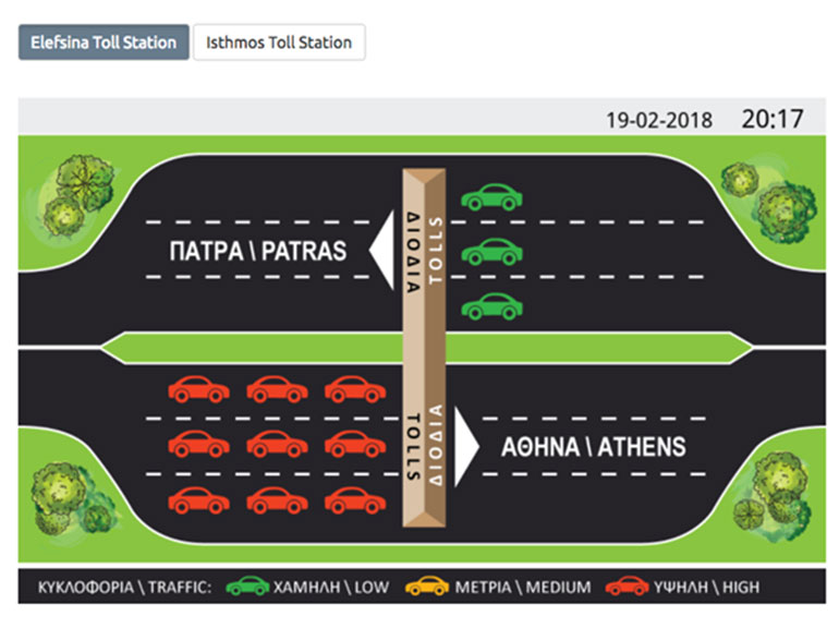 1. Να βλέπουν την τρέχουσα κυκλοφορία σε δύο σταθερά σημεία του αυτοκινητόδρομου, στα διόδια της Ελευσίνας και τα διόδια του Ισθμού κατά την αναγραφόμενη μέρα και ώρα. Συγκεκριμένα, στην εφαρμογή αποτυπώνεται η πυκνότητα της κυκλοφορίας των προηγούμενων τελευταίων 15’ της ώρας. Η αποτύπωση είναι γραφιστική, αφορά και τα δύο ρεύματα κυκλοφορίας (προς Πάτρα και προς Αθήνα) και σημαίνεται με διαφορετικούς χρωματισμούς ανάλογα με την έντασή της (χαμηλή, μέτρια, υψηλή).