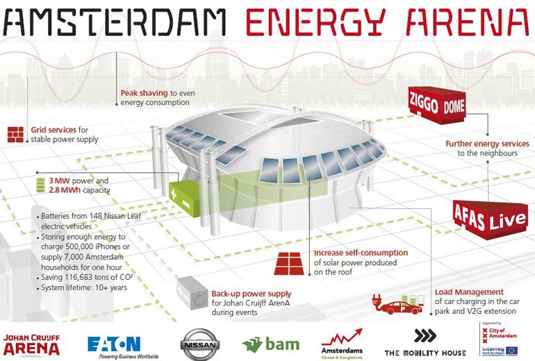 Με αυτό το σύστημα έχει ήδη εξοπλιστεί το στάδιο «Johan Cruyff Arena», η έδρα της ομάδας ποδοσφαίρου του Άγιαξ στην Ολλανδία. Mε ισχύ 3MW και χωρητικότητα 2.8ΜWh, το συγκεκριμένο σύστημα μπορεί να τροφοδοτήσει αρκετές χιλιάδες νοικοκυριά, ενώ η ενέργεια που παράγεται από τους 4.200 ηλιακούς συλλέκτες στην οροφή του, αποθηκεύεται και χρησιμοποιείται με τον βέλτιστο τρόπο «ανακουφίζοντας» το ενεργειακό δίκτυο.
