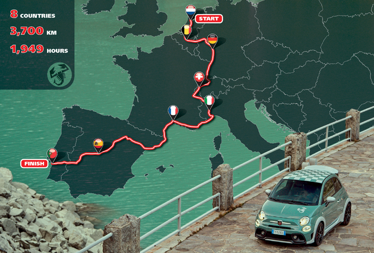 Οι οδηγοί του Abarth 695 70° Anniversario θα ξεκινήσουν από την Ολλανδία, θα περάσουν από Βέλγιο, Γερμανία, Ελβετία, Ιταλία, Γαλλία και Ισπανία πριν καταλήξουν στην Πορτογαλία.