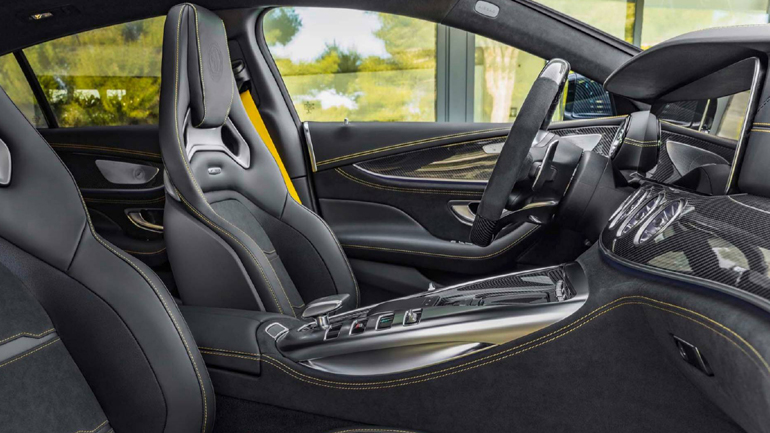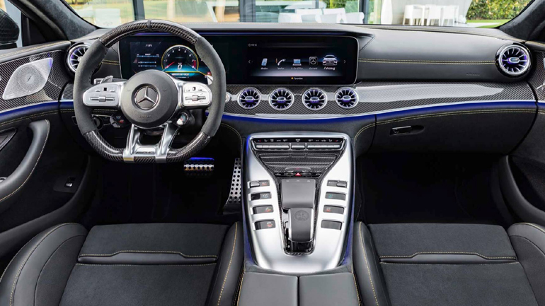 Όλες οι επιφάνειες στο σαλόνι καλύπτονται από δέρμα, alcantara και ανθρακονήματα. Οι μεγάλες οθόνες μπροστά από τον οδηγό και στην κεντρική κονσόλα περιλαμβάνονται στον βασικό εξοπλισμό, όπως και τα μπάκετ καθίσματα.