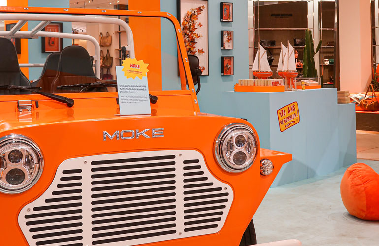 H pop-up παρουσίαση της MOKE International αφορά το Electric MOKE στον ιδιαίτερο χρωματισμό Sunset Orange, το οποίο έχει επιλεγεί για να εναρμονιστεί με την εορταστική αισθητική των γενεθλίων του Le Bon Marché.