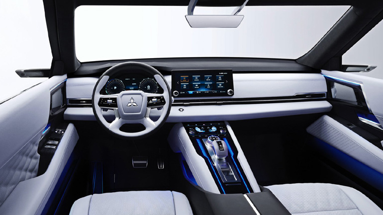 Η καμπίνα δεν θυμίζει κανένα Mitsubishi που έχουμε δει έως τώρα. Οι λευκές δερμάτινες επενδύσεις, η μεγάλη οθόνη αφής, ο ψηφιακός πίνακας οργάνων, η κομψή κονσόλα με την οθόνη για τον κλιματισμό και τον μοχλό ταχυτήτων, καθώς και ο μπλε φωτισμός, προσδίδουν στυλ και αναδεικνύουν τα premium χαρακτηριστικά του μοντέλου.