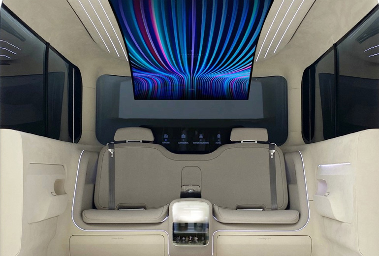 Πέρα από την άνεση και την ευκολία, το πιο εντυπωσιακό χαρακτηριστικό του πρωτότυπου οχήματος είναι η ευέλικτη οθόνη OLED 77 ιντσών που καλύπτει μεγάλο μέρος της οροφής του εσωτερικού. Οι επιβάτες του πίσω καθίσματος μπορούν να προσαρμόσουν τον βαθμό καμπυλότητας της οθόνης χειροκίνητα για τη βέλτιστη γωνία θέασης. Επίσης, τα ηχεία που είναι τοποθετημένα στο προσκέφαλο του καθίσματος δημιουργούν μια προσωπική ηχητική ζώνη αφήνοντας ανενόχλητο τον διπλανό επιβάτη.