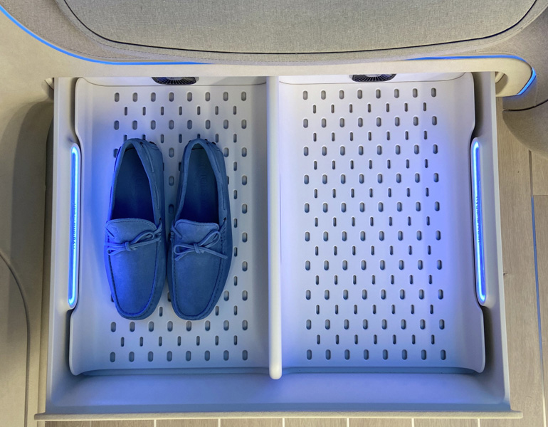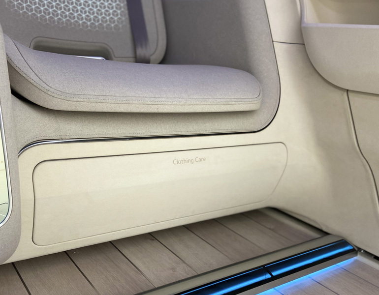 Το σαλόνι του Ioniq Cabin είναι πραγματικά εκπληκτικό. Για παράδειγμα, η καφετιέρα φτιάχνει και προσφέρει στον οδηγό τον πρώτο καφέ της ημέρας για την πρωινή μετακίνηση, ενώ ένα τμήμα κάτω από το κάθισμα στεγνώνει και φρεσκάρει τα βρεγμένα ή παλιά παπούτσια του πριν φτάσει στον προορισμό. Επιπλέον, ο διαχειριστής της γκαρνταρόμπας φροντίζει να μένουν τα ρούχα τακτοποιημένα και χωρίς τσάκιση κατά τη διάρκεια της οδήγησης και το μίνι ψυγείο διατηρεί τα αναψυκτικά δροσερά.