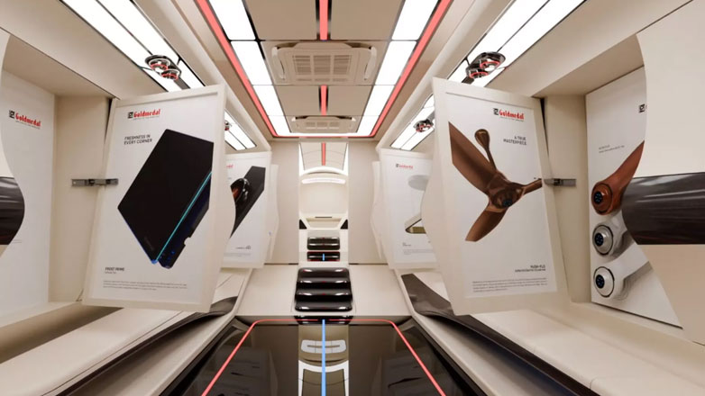 Ειδικές θήκες κατά μήκος των πλευρικών τοίχων παρουσιάζουν τα προϊόντα υψηλής ποιότητας της εταιρείας στους δυνητικούς πελάτες, οι οποίοι μπορούν επίσης να έχουν πρόσβαση σε χώρο αναμονής και μίνι μπαρ. Όπως σε κάθε χώρο λιανικής πώλησης, η καμπίνα είναι καλά φωτισμένη, διαθέτοντας πάνω από 10.000 LED με ρυθμιζόμενη φωτεινότητα. Σύμφωνα με την ιστοσελίδα της, η Goldmedal Electricals ειδικεύεται σε αρθρωτές συσκευές καλωδίωσης, συστήματα οικιακού αυτοματισμού, φωτισμό LED, MCBs, πίνακες διανομής, καλώδια και σύρματα, κουδούνια, ηλεκτρικά αξεσουάρ και σωλήνες PVC.