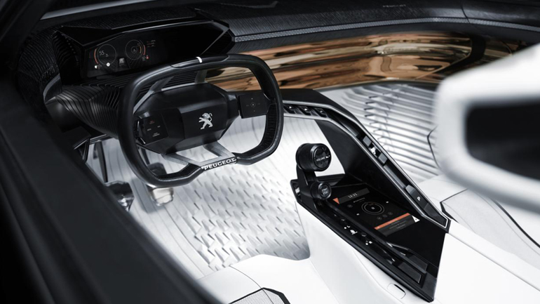 Η καμπίνα αποτελείται σε ποσοστό 80% από 3D εκτυπωμένα υλικά, στο κέντρο της κονσόλας υπάρχει μια οθόνη 7,7 ιντσών και στο παρμπρίζ ένα προηγμένο head – up display υψηλής ευκρίνειας. Ιδιαίτερη σημασία έχει στον ήχο, με τους ανθρώπους της Peugeot να τοποθετούν ένα ηχοσύστημα 9.1.2 που αποτελείται από 3 ηχεία, 2 tweeters, 2 woofers και 1 subwoofer για το εμπρός μέρος και 2 ηχεία, 2 tweeters και 1 woofer για το πίσω.