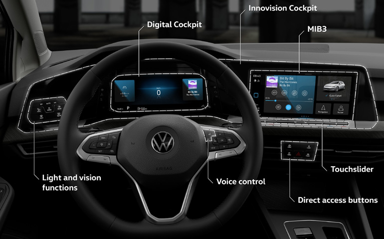 Το καινούριο Golf θα έχει αρκετά πλούσιο εξοπλισμό από τη βασική έκδοση, περιλαμβάνοντας μεταξύ άλλων και το Innovision Cockpit, που έκανε πρεμιέρα στο Touareg. Πρόκειται για έναν ενοποιημένο πίνακα ελέγχου που περιλαμβάνει τον ψηφιακό πίνακα οργάνων (Digital Cockpit) με την οθόνη 10 ιντσών, το σύστημα πολυμέσων με την οθόνη 8,25 ιντσών και το πολυλειτουργικό τιμόνι με τα ψηφιακά χειριστήρια.