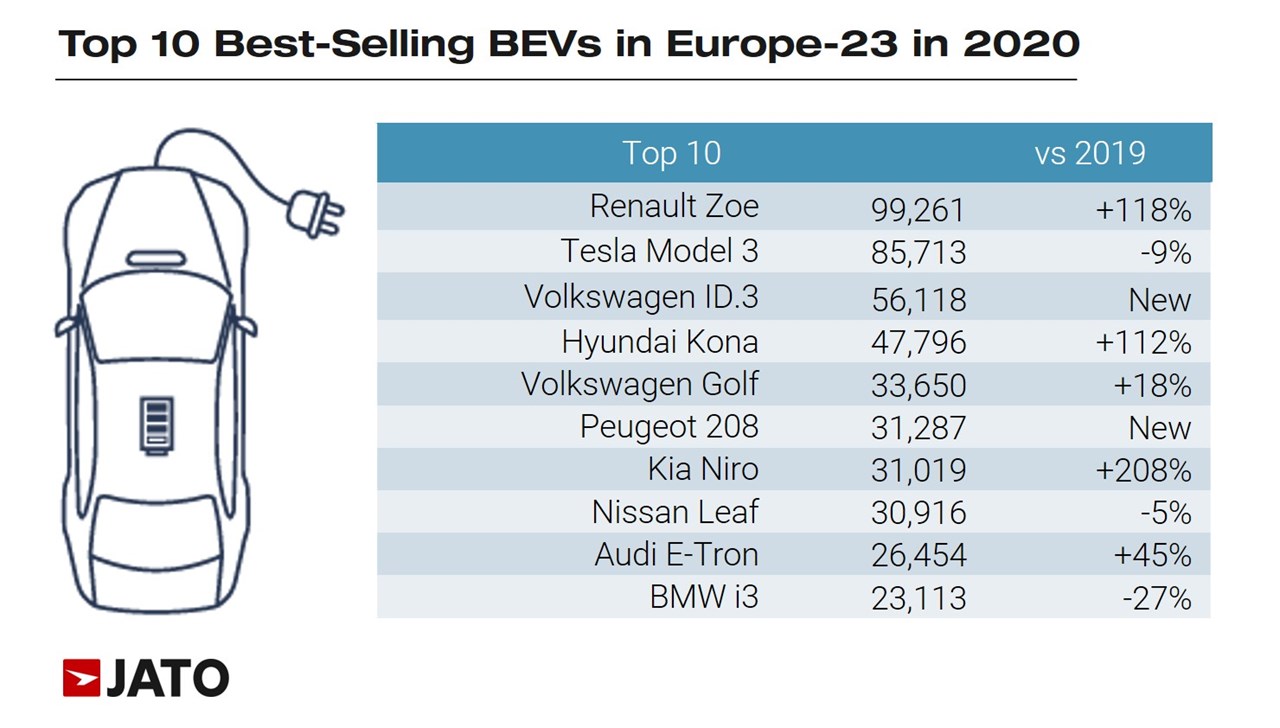 Την πρώτη δεκάδα των δημοφιλέστερων αυτοκινήτων τεχνολογίας EV στην Ευρώπη το διάστημα Ιανουαρίου-Τα EV και plug-in απέσπασαν το 2020 μερίδιο 12%.Δεκεμβρίου 2020, συμπλήρωσαν τα Hyundai Kona Electric, VW e-Golf, Peugeot e-208, Kia e-Niro, Nissan Leaf, Audi e-tron και BMW i3.