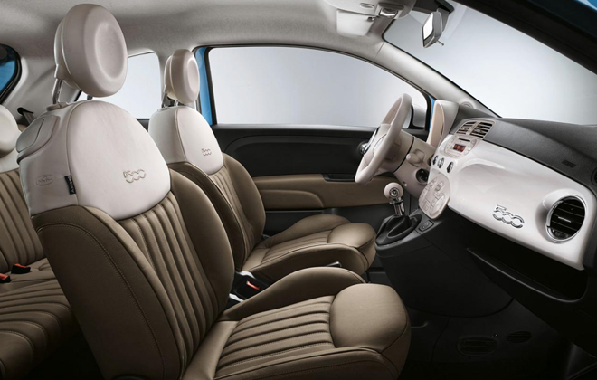 Στο εσωτερικό, έχουν τοποθετηθεί δερμάτινα καθίσματα Poltrona Frau σε διπλή απόχρωση ivory/tobacco και το ταμπλό είναι σε άσπρο χρώμα. Σε διάφορα τμήματα, υπάρχουν ειδικά ταμπελάκια με τα ιστορικά σήματα της Fiat, ενώ στον εξοπλισμό περιλαμβάνεται το σύστημα Blue&Me.