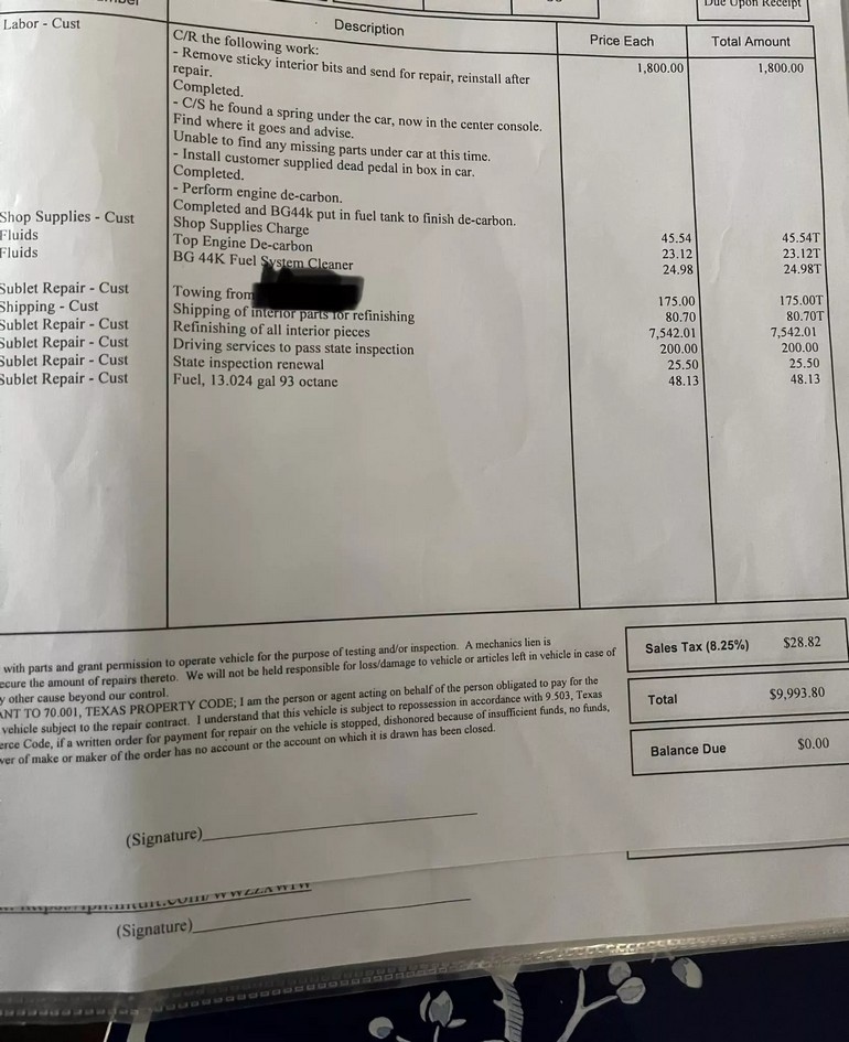 Μάλιστα στην απόδειξη που δημοσίευσε υπάρχουν διάφορες χρεώσεις όπως 80 δολάρια για την αποστολή των εσωτερικών εξαρτημάτων για φινίρισμα και 1.800 δολάρια για τα εργατικά. Όλες οι εργασίες ήταν απλές και μικρές, με τον ιδιοκτήτη να αναφέρει πως ουσιαστικά χρεώθηκε εν τέλει σχεδόν 10.000 δολάρια για να του αλλάξουν μερικά κουμπιά που κολλούσαν με τον ίδιο να πουλάει τελικά το μοντέλο και να αγοράσει μία C8 Corvette.