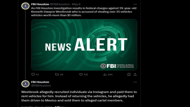 Σύμφωνα με το Γραφείο του Εισαγγελέα των ΗΠΑ για τη Νότια Περιφέρεια του Τέξας, ο 29χρονος Kenneth Dwayne Westbrook βρισκόταν πίσω από ένα σχέδιο κλοπής οχημάτων στην Αμερική και στη συνέχεια μεταφοράς τους στο Μεξικό. Οι ομοσπονδιακοί δεν υπεισήλθαν σε πολλές λεπτομέρειες, αλλά είπαν ότι ο Westbrook χρησιμοποιούσε το Instagram για να στρατολογεί ανθρώπους που νοίκιαζαν οχήματα για λογαριασμό του.