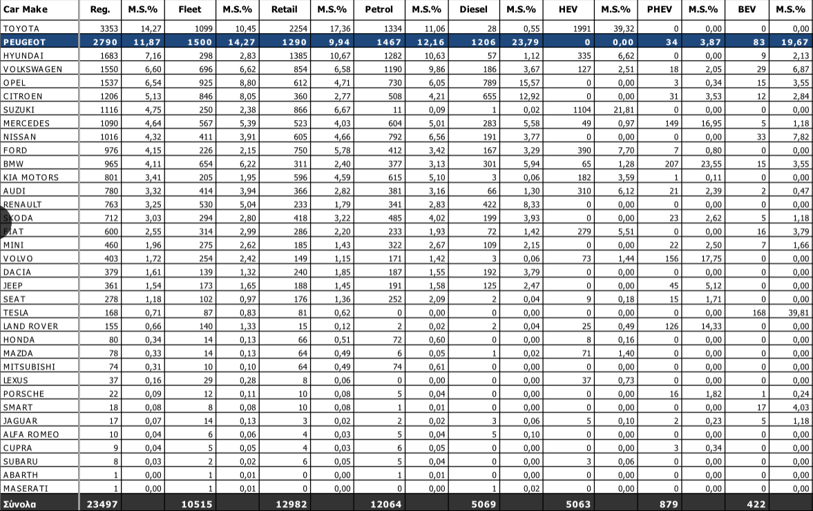 Αναλυτικά η Peugeot διατηρεί σταθερά την δεύτερη θέση στις συνολικές ταξινομήσεις της αγοράς. Πρωτιά έχει για το 2008 (με διαφορά από το δεύτερο) στην κατηγορία B-SUV (σε όλα τα κανάλια πώλησης) καθώς επίσης και πρωτιά για το  e-208 και e-2008.