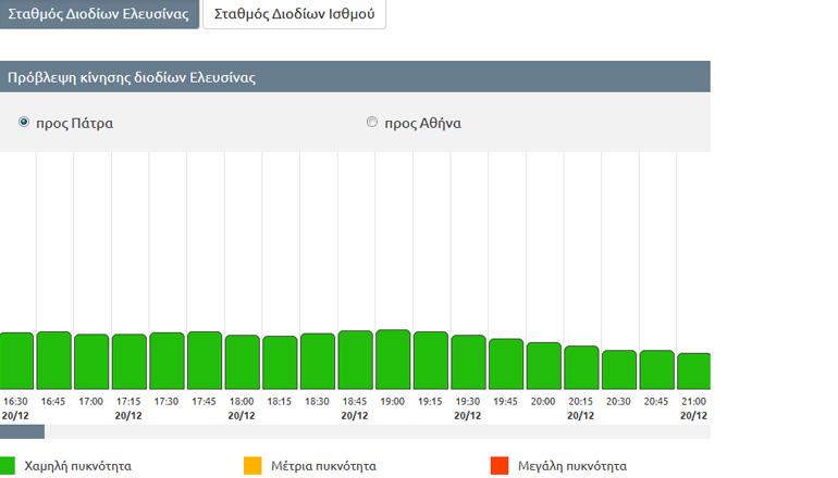 Να βλέπουμε την πρόβλεψη της κυκλοφορίας στα διόδια της Ελευσίνας και του Ισθμού και για τις δύο κατευθύνσεις για τις επόμενες τρεις μέρες (72 ώρες), μετακινώντας απλώς τη γκρι μπάρα κάτω από το διάγραμμα.