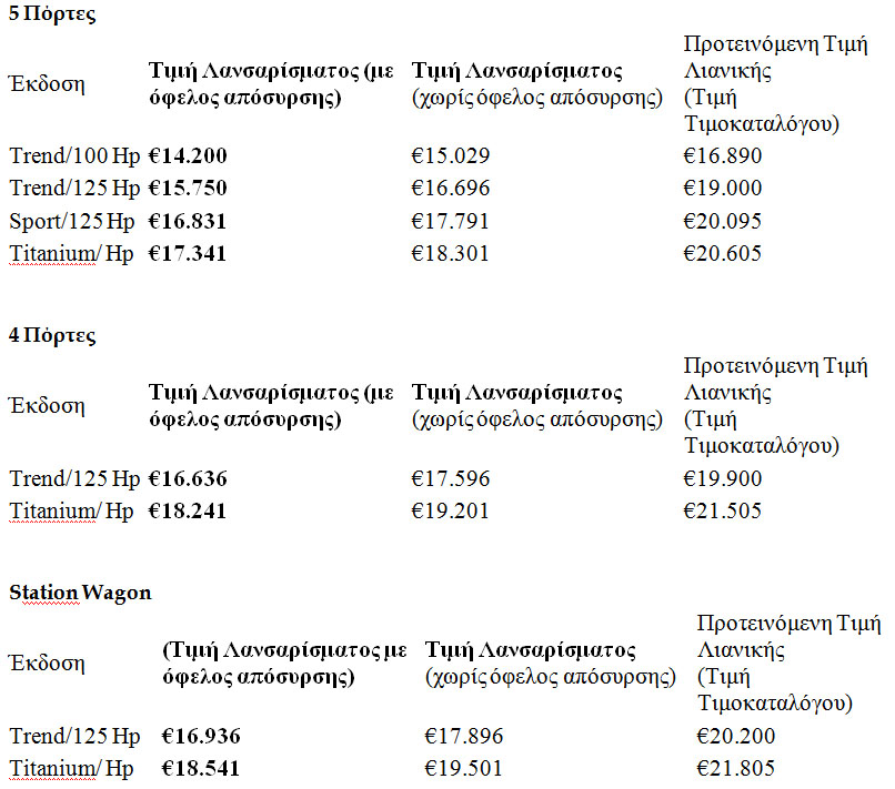 Η ελληνική εισαγωγική εταιρεία, θέλοντας να δώσει ένα κίνητρο στους υποψήφιους αγοραστές, το προσφέρει σε ειδικές τιμές τουλάχιστον για τον μήνα Μάιο. Παρακάτω μπορείτε να δείτε αναλυτικά τις τιμές του Focus σε εκδόσεις 4 και 5 θυρών αλλά και station wagon.