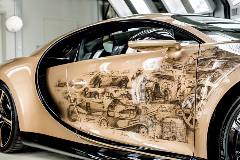 Οι καλλιτέχνες, έμπειροι και καταξιωμένοι σχεδιαστές της Bugatti σχεδίασαν σχολαστικά με το χέρι τα 19 σκίτσα στην πλευρά του οδηγού – που απεικονίζουν τη σύγχρονη εποχή της Bugatti από το 1987, ακολουθώντας την EB110 μέχρι τη Veyron και την Chiron1 – και 26 σκίτσα στο η πλευρά του συνοδηγού , ορόσημα της Bugatti από το 1909 έως το 1956, συμπεριλαμβανομένων των εικονιδίων όπως το Type 41 Royale και το Type 57 SC Atlantic.