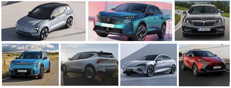 BMW 5-series , BMW XM, BYD Atto 3, BYD Dolphin, BYD Han, BYD Seal, Fiat 600e, Ford Bronco, Honda CR-V, Honda e:NY1, Honda ZR-V, Hyundai Ioniq 6, Hyundai Kona, Jeep Grand Cherokee, Kia EV9, Lexus RZ, Lucid Air, Mercedes-Benz E-class, Mercedes-EQ EQE SUV, Nio ET7, Peugeot E-3008/3008, Renault Espace, Renault Scenic, Smart #1, Toyota C-HR, Toyota Prius, Volkswagen ID.7, Volvo EX30